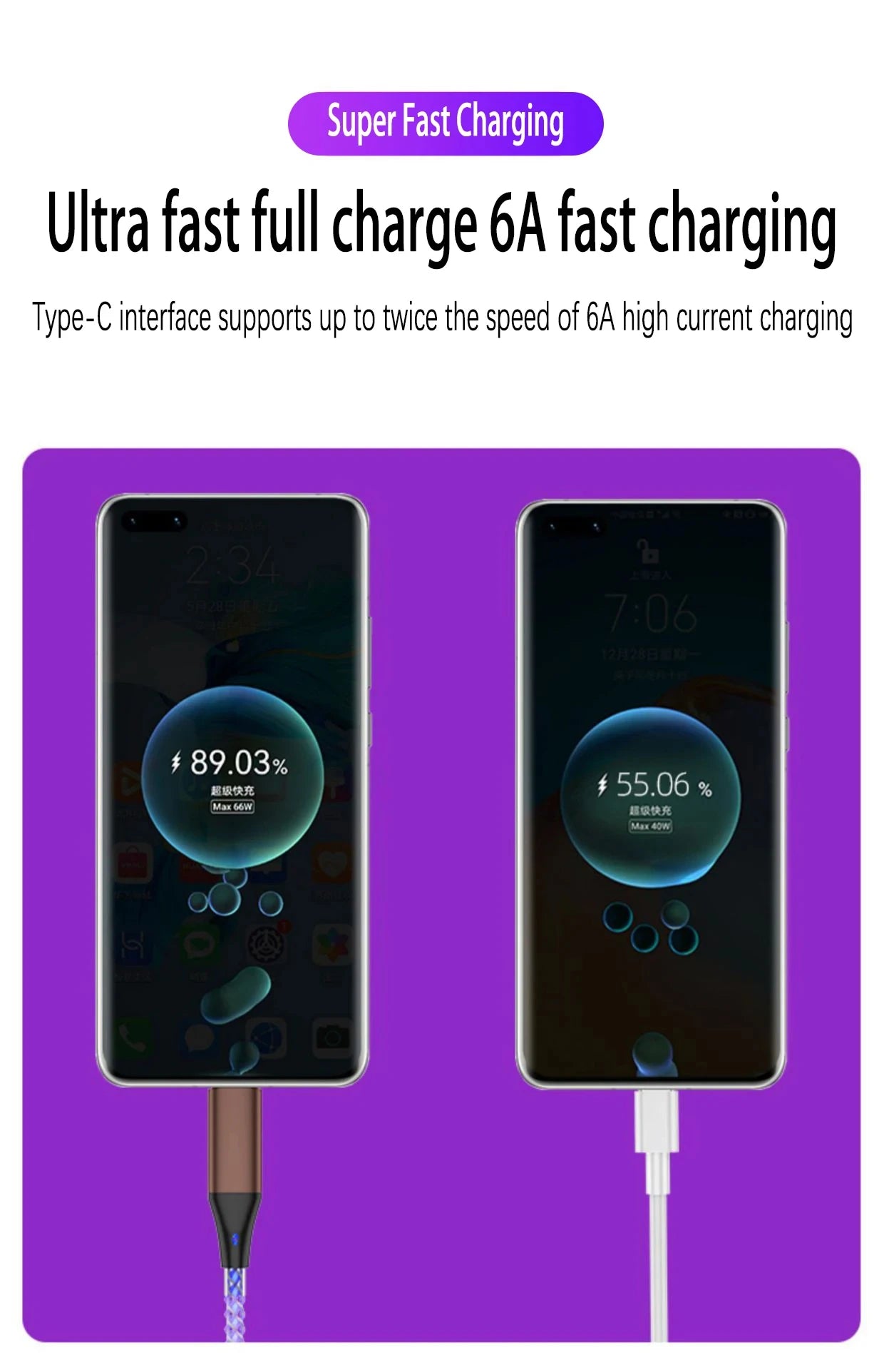 6A Super Fast Charging Colorful Light Data Cable A Drag Three RGB Breathing Gradient Car Charging Cable USB 3 In 1 Universal